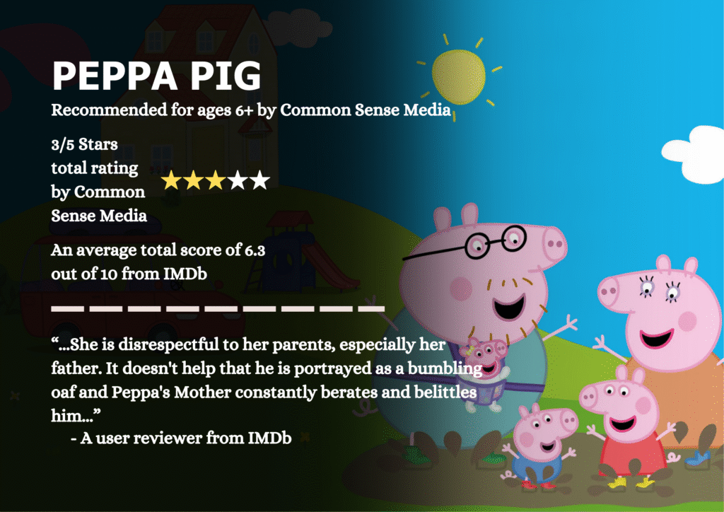 But on the other hand, not all children’s media are the same, as other media for young children are sometimes of poor or low quality. Parent reviews of the show Peppa Pig tells us a lot regarding their thoughts on the show itself. Although there are a few noticeable troll comments, one common problem that the parents found was that Peppa is extremely rude and often times have a lot of verbal aggression. One parent expressed that the “brattiness of the MC is hidden by laughter and cuteness”, and then further explained that Peppa bullying her father, refusing to listen, and acting entitled is not cute. The parent was shocked to see that Peppa bullied her own father by fat shaming him when their child started “acting up” to what the parent’s child was watching. Regarding a review score from IMDb, Peppa Pig has an above average star rating of 6.3 out of 10. There are a sizable amount of viewers who do not think that this show is suitable for children to watch, or even a suitable show to teach children.